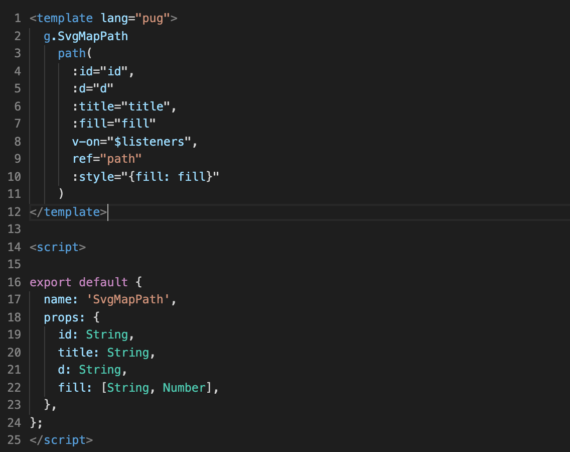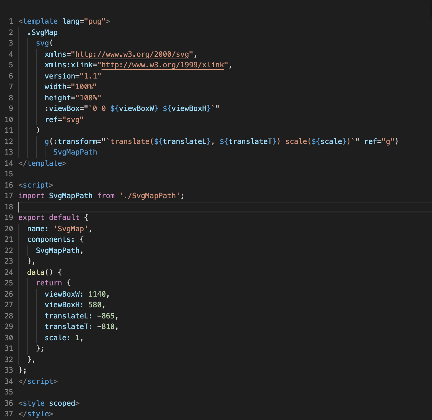 The component will consist of two files, the main component will be called, for example, SvgMap.vue - this is our file in which we will keep the main SVG hierarchy.