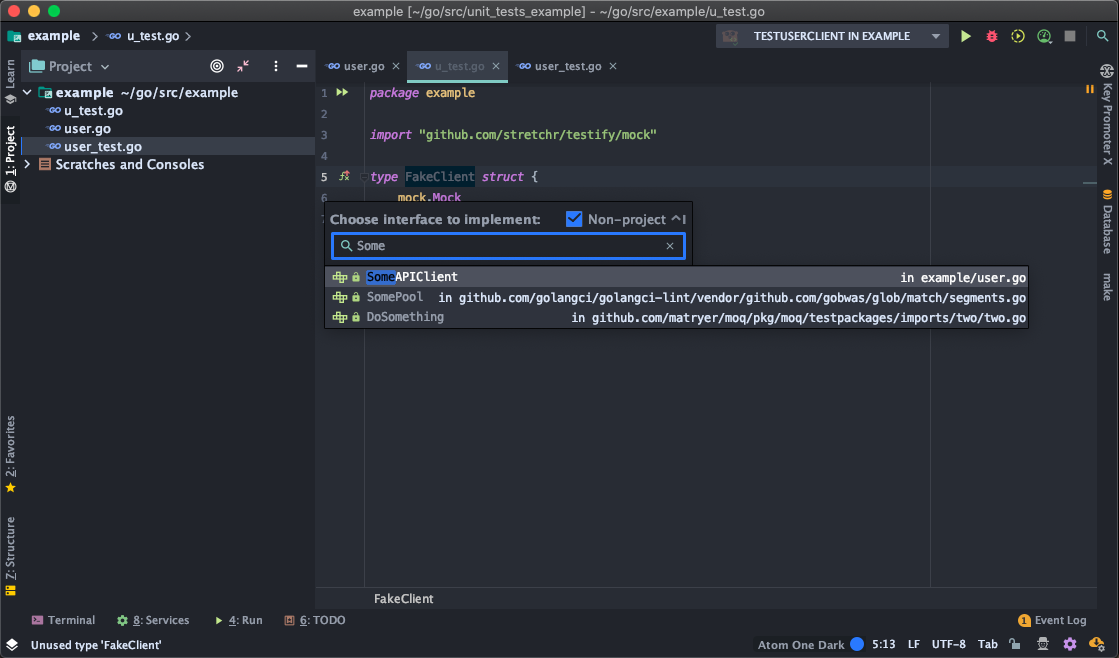 When I started to write unit-tests in golang at first it wasn't easy and it was taking much time. I didn't know specific tools, technique and libraries to make easy writing of tests. Mocking interfaces was scary and caused a lot of confusion as the implemented interfaces were turned into a sprawling tree of ifs. All this led to such tests becoming difficult to maintain. Over time, I found a package testify of tools that make easy the writing of tests and also GoLand (IDE to golang) which allow you generate interface implementation. Let me show you example of that. Let's say we need to get the user data, we have the API client for that. We need to make for this client an interface and data structure and a simple function that helps us get a user.